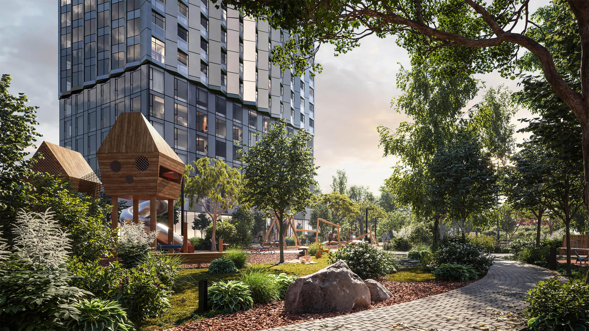 Для детей предусмотрены игровые площадки с современным покрытием и интерактивными элементами, а для взрослых — зоны воркаута, йоги и спортивных активностей. Благоустройство основано на принципах устойчивого развития, с применением многолетних растений, водопроницаемых покрытий и энергосберегающего освещения.