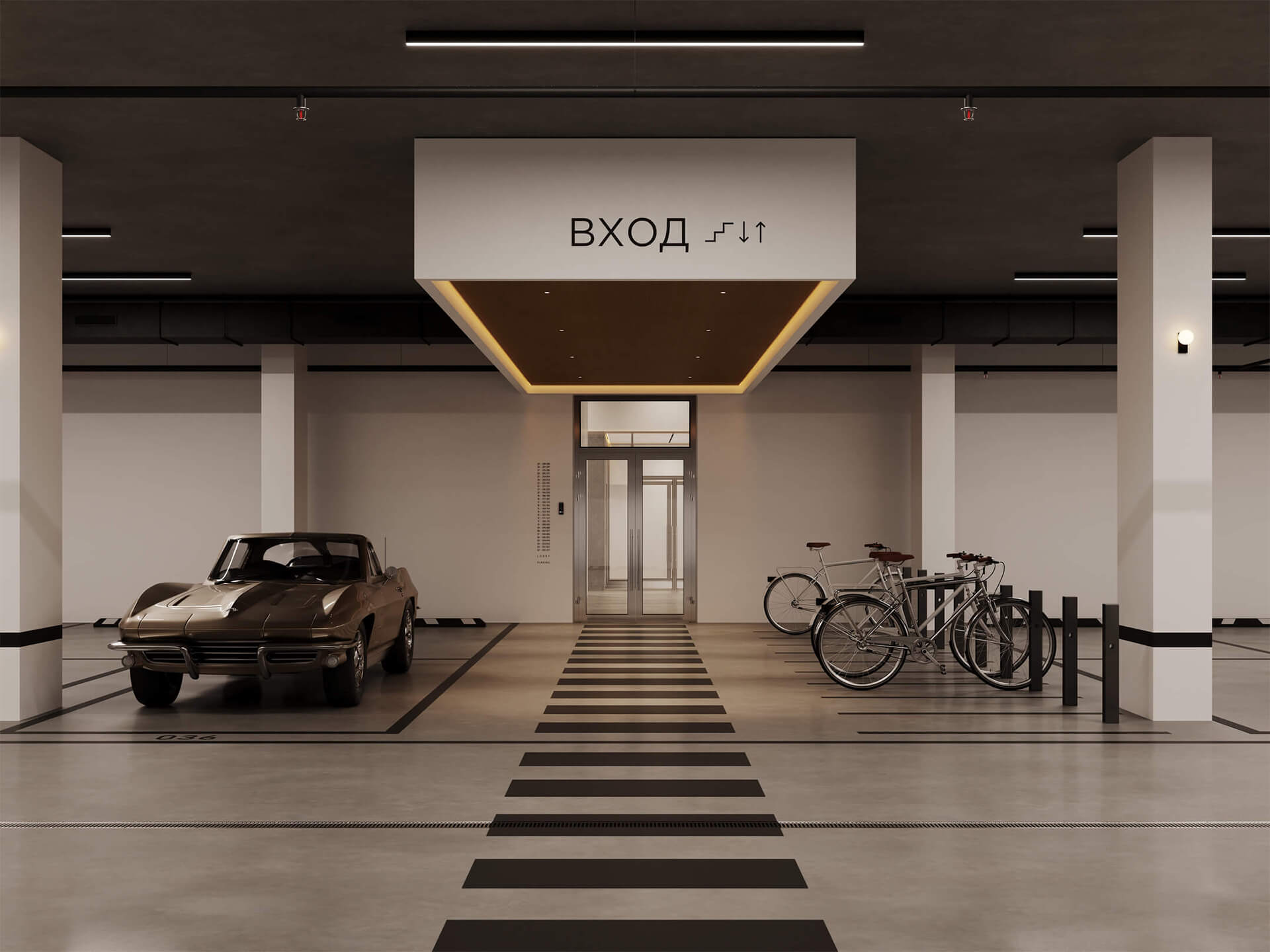 Пространство оснащено современными системами видеонаблюдения, пожарной сигнализации и вентиляции. Въезд осуществляется по системе распознавания автомобильных номеров, что исключает задержки и гарантирует приватность. Наличие подземного паркинга позволяет сохранить дворовое пространство свободным от автомобилей, делая его полностью пешеходным и зелёным.