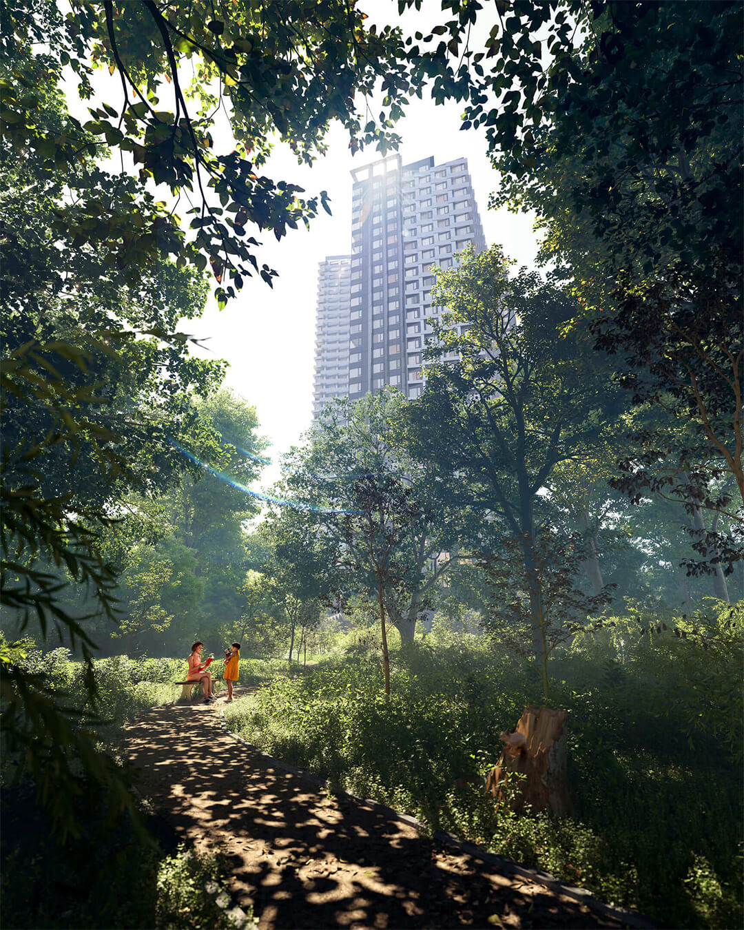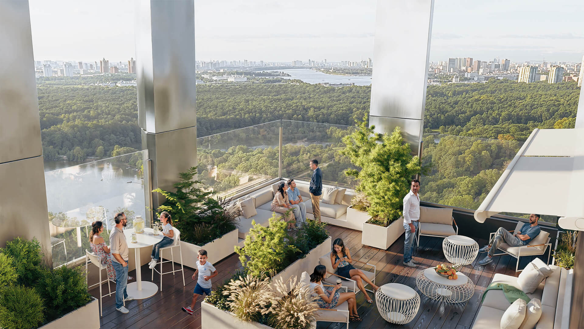 Башни расположены под разными углами к центральной оси, что обеспечивает максимальный уровень приватности и идеальную инсоляцию в каждой квартире. Архитектура «Моментс» становится продолжением природы: здания словно вырастают из зелёной среды, а высокие этажи открывают живописные виды на парк, Москву-реку и исторические кварталы северо-запада столицы.